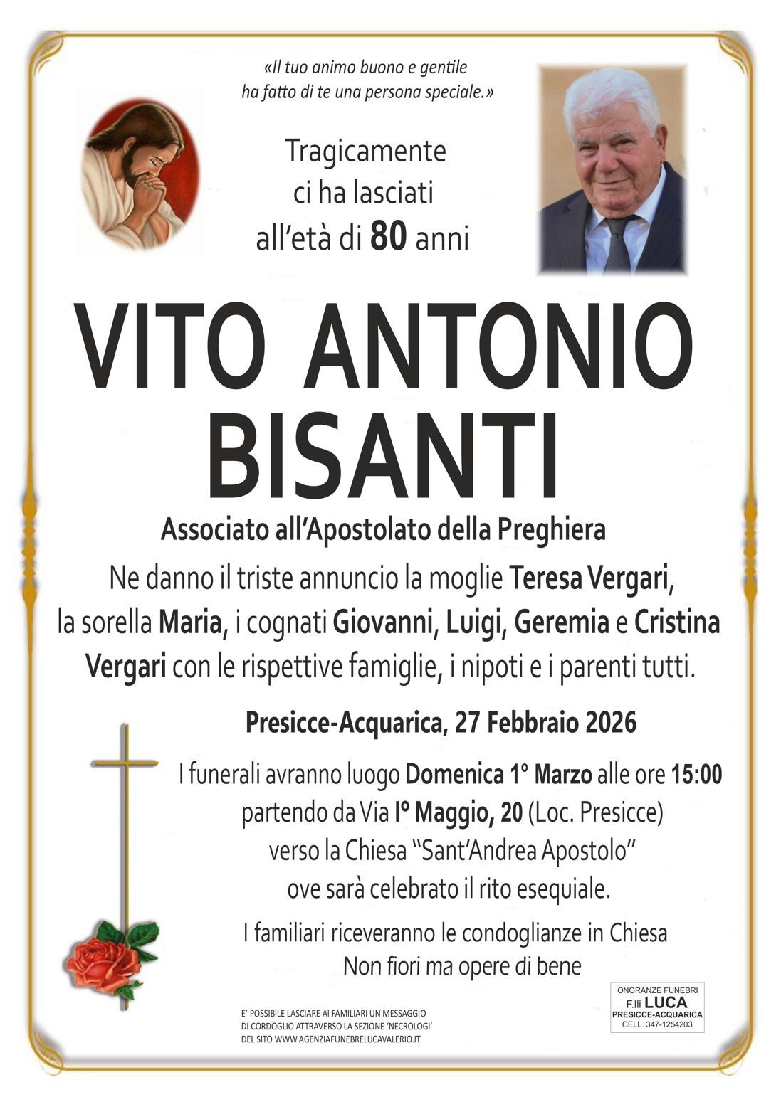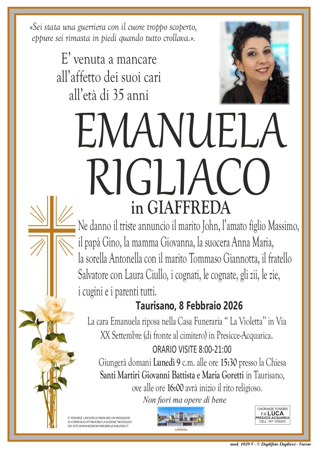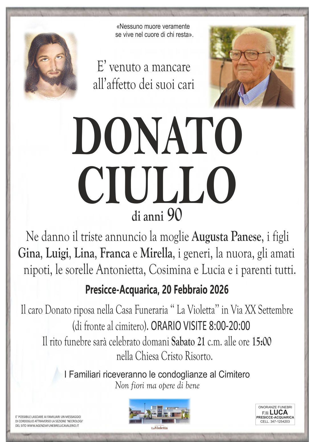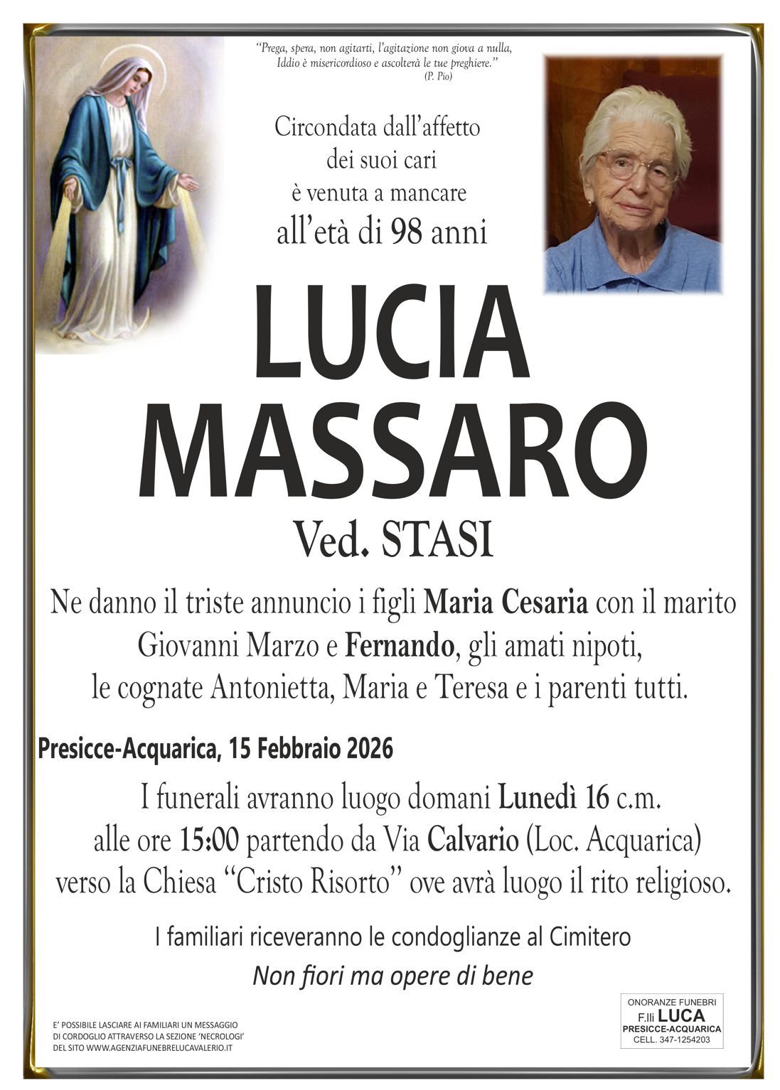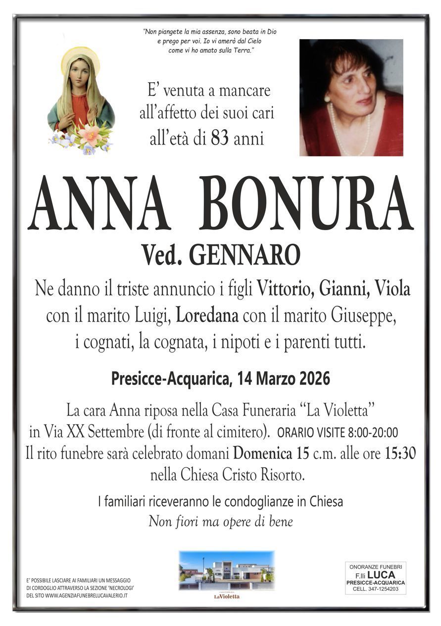 In questa sezione troverete i necrologi online, cliccando sul nominativo che vi interessa, si apre la pagina corrispondente al necrologio richiesto, che contiene al suo interno alcune informazioni inerenti il defunto, lo svolgimento delle onoranze funebri e sarà inoltre possibile inviare un messaggio di cordoglio alla famiglia tramite la nostra agenzia.